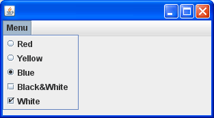 JRadioButtonMenuItem : این کامپوننت را می توان در کامپوننت JMenuBar اضافه نمود. در JMenuBar همچنین می توان از JCheckBoxMenuItem نیز استفاده کرد.