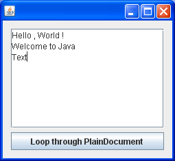 کلاس PlaintDocument حالت خاصی از پیاده سازی با استفاده از کلاس AbstractDocument است. در این کلاس هیچ خاصیتی در مورد کاراکتر های و محتویات کامپوننت متنی نگهداری نمی شود و در عوض می توان بوسیله این کلاس موقعیت عناصر و یا اینکه هر خط از کجا شروع می شود را پیدا کرد. در برنامه زیر در بین عناصر یک PlainDocument حرکت کرده و آنها را به خروجی ارسال می کنیم . تصویر زیر نمایی از این برنامه نشان می دهد.