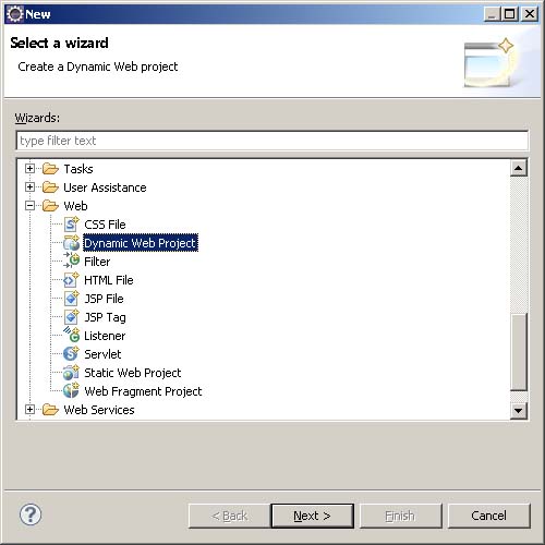 گام دوم: ابزار برنامه نویسی Eclipse را باز کرده و از منوی File-> New-> Other...->Web گزینه Dynamic Web Project را همانند تصویر زیر انتخاب نموده و بر روی دکمه Next کلیک نمائید.