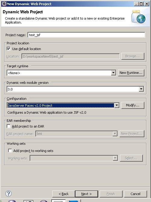 گام سوم: در کادر محاوره ای که نشان داده میشود، نام پروژه خود را انتخاب نموده و از قسمت Configuration گزینه JavaServer Fcaes 2.0 project را همانند تصویر زیر انتخاب نمائید.